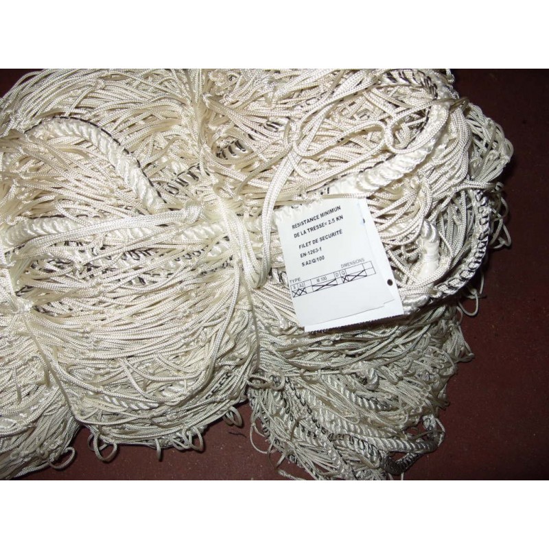 FILET DE SECURITE EN 1263-1 : Mailles 100 mm, Ø 4.75 mm, découpées en mailles carrées, en tresse polyamide blanche haute tenacité, équipé d’une ralingue blanche haute tenacité Ø 12 mm passée entre toutes les mailles et entièrement cousue au pourtour du filet